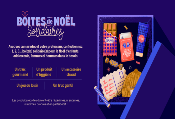 Pour le mois de la solidarité, au mois de décembre, des élèves de première et terminale organisent une collecte de vêtements chauds, de produits d'hygiène, de gourmandises, jeux ou loisirs, parfum .... qui seront remis ensuite à des sans abris.