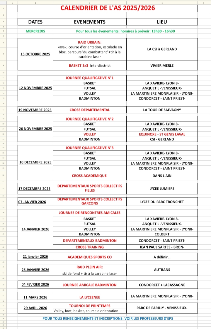 Voici le calendrier des rencontres, compétitions et événements de l'Association Sportive pour l'année 2025-2026